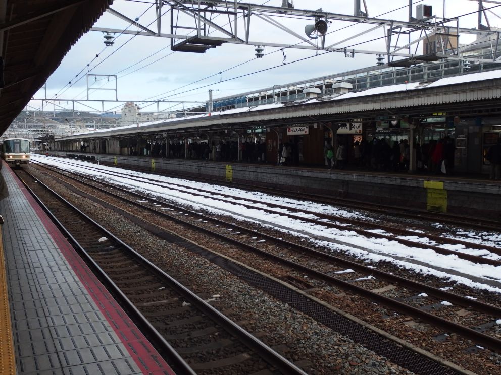 京都駅に着いたら、線路にいきなり積雪が。京都駅でこんなの、初めての経験です。
